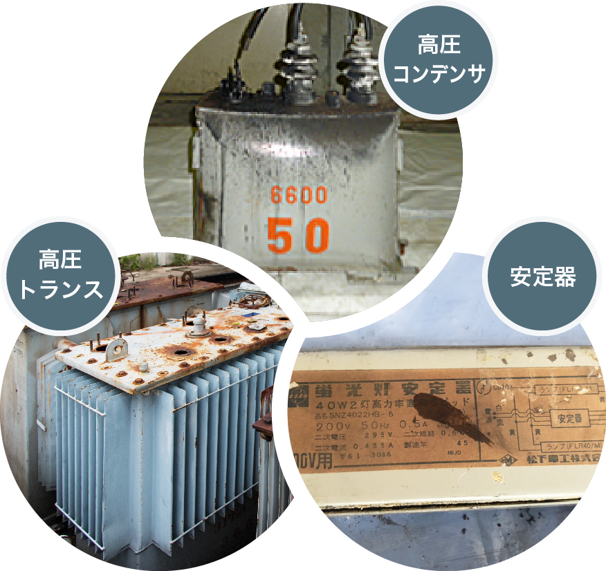 蛍光灯安定器や水銀灯、また、トランスやコンデンサ等の廃電気機器には有害性物質であるPCB(ポリ塩化ビフェニル)を含む