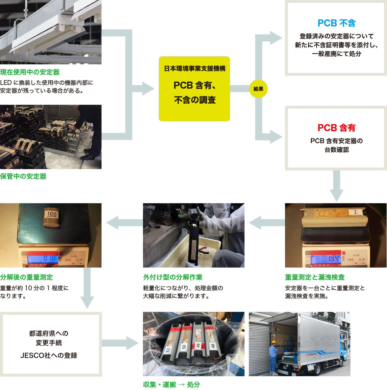 蛍光灯や水銀灯などに使用されていた、保管されている廃安定器は、PCBを含有の場合、高濃度PCBとなります。 PCBを含有した安定器の処分は中間貯蔵・環境安全株式会社(JESCO社)でしかできません。 またその処分費用は1キロあたり30,800円と大変高額なため、しっかりとした含有・不含の仕分け調査と、 正確な総重量の把握ををすることが処理費用を削減する有効な手段となります。